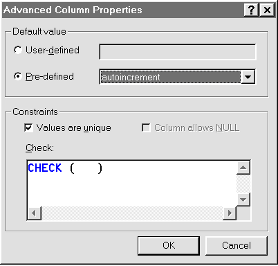 Рис. 46. Окно дополнительных свойств поля таблицы данных В этом окне можно определить значения, присваиваемое полю по умолчанию. Речь идет о значениях полей новых записей. Новые записи добавляются в таблицы при выполнении SQL-оператора INSERT. В этом операторе для каждой новой записи указывается перечень инициализируемых полей и их значений. Полям, отсутствующих в этом перечне, присваиваются значения, определенные по умолчанию. Если значение по умолчанию не установлено, то в поле записывается значение NULL. В SYBASE SQL Anywhere пользователям предоставляется возможность устанавливать произвольные значения полей по умолчанию в виде :