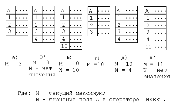 Рассмотрим AUTOINCREMENT подробнее. В поле A с таким значением по умолчанию всегда записывается число на единицу превышающее текущий максимум M. М содержит максимальное значение среди всех ранее введенных в поле A, в том числе и уже удаленных записей. Если для поля A в операторе INSERT (добавляет новую запись) указано конкретное значение N, то: