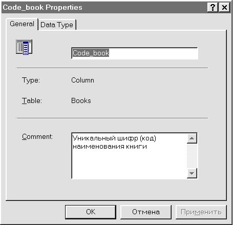 Рис. 48. Окно свойств поля Code_book - вкладка General Вкладка General этого окна позволяет изменить название поля и при необходимости сделать краткий комментарий о назначении поля. Для модификации названия поля в утилите ISQL необходимо выполнить следующий SQL-оператор: /* Изменение в таблице Books названия поля "Code_book" на "Code_b" */ ALTER TABLE Stepanov.Books RENAME Code_book TO Code_b Вкладка Data Type этого окна (рис. 49) предназначена для изменения типа данных поля.