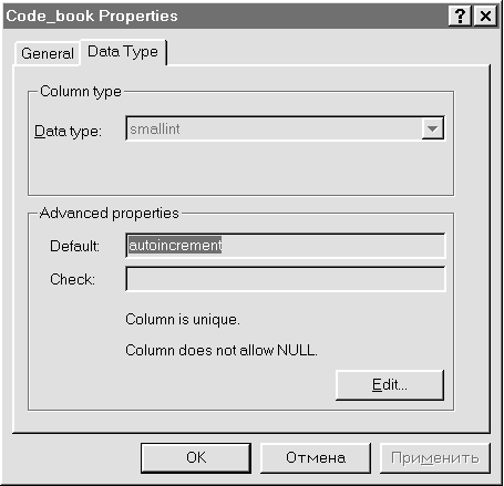 Рис. 49. Окно свойств поля Code_book - вкладка Data Type Для поля входящего в состав первичного или составного ключа изменить тип данных поля невозможно. Этот момент представлен на рис. 49, список Data type не доступен. Другой функцией вкладки Data Type является анализ таких свойств поля как признак разрешения хранения значений NULL, значение, присваиваемое полю по умолчанию, признак уникальности значений поля и условие, накладываемое на значения поля. Для изменения этих свойств необходимо щелкнуть мышью по кнопке Edit. В этом случае на экране появляется окно Advanced Column Properties (см.рис.46), которое было рассмотрено выше. В утилите ISQL также имеется возможность изменения типов полей и проанализировать свойства полей. Информация об этих свойствах может быть получена при помощи SQL-оператора SELECT из системного представления SYS.SYSCOLUMNS. Изменение типов данных полей реализуется оператором ALTER TABLE. Для изменения в поле Books.Number типа данных Smallint на Integer следует воспользоваться оператором вида: /* Изменение типа данных поля /* ALTER TABLE Stepanov.Books MODIFY Number INTEGER Таким образом, используя контекстное меню свойств поля можно проанализировать его свойства, а при необходимости и отредактировать их. Назад | Содержание | Вперед