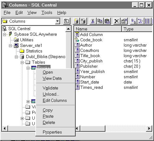 Для задания свойств таблицы в утилите SQL Central следует установить соединение с базой данных Dubl_Biblia. Затем необходимо в левой или правой панели щелкнуть правой клавишей мыши по пиктограмме требуемой таблицы, например таблицы Books. В результате этого на экране появляется контекстное меню (см. рис. 50).