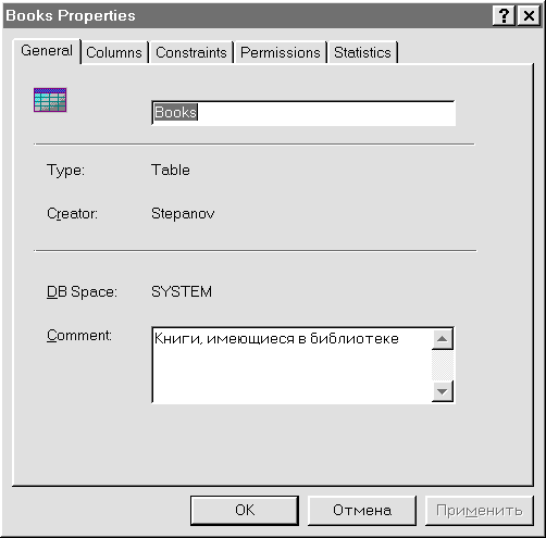 /* запуск на исполнение командного файла SQL-операторов */ READ <ПУТЬ>, где ПУТЬ - полное имя командного файла SQL-операторов. После этого новая база данных становится точной копией исходной. Реакцией на пункт меню Edit Columns является запуск редактора структуры таблиц (см. рис. 42). Право использовать этот пункт меню имеют владелец таблицы, пользователи с классом полномочий DBA (см. п. 5.2) и пользователи, для которых для работы с таблицей установлена привилегия ALTER(см. табл. 7). Выбор пункта Copy позволяет запомнить в системном буфере свойства текущей таблицы с целью копирования их в дальнейшем в другую базу данных. Для этого требуется в текущем сеансе работы утилиты SQL Central осуществить соединение с другой базой данных. Затем для нее отобразить в правой панели содержимое папки Tables. После этого следует щелкнуть в любом свободном месте правой панели правой кнопкой мыши и выбрать в появляющемся контекстном меню пункт Paste. В результате этого на основании данных системного буфера создается копия таблицы первой базы данных. Следующим пунктом контекстного меню установки свойств таблицы данных является пункт Paste. Применять этот пункт могут только владелец таблицы, пользователи, имеющие для этой таблицы привилегию ALTER (см. табл. 7) и администратор базы данных. Пункт Paste позволяет добавлять в текущую или другую базу данных копию таблицы, информация о которой была запомнена при выборе пункта Copy рассматриваемого меню. Посредством выбора пункта Delete осуществляется удаление текущей таблицы из базы данных. Это могут сделать только владелец таблицы или администратор базы данных. В утилите ISQL для исключение таблицы Stepanov.Books из базы необходимо выполнить следующий оператор: //Удаление таблицы из базы данных DROP TABLE Stepanov.Books Последний пункт рассматриваемого меню Properties позволяет проанализировать и модифицировать свойства текущей таблицы. Изменять эти свойства могут только владелец таблицы, пользователи, имеющие для этой таблицы привилегию ALTER (см. табл. 7)и администратор базы данных. Другие пользователи могут только просматривать свойства таблицы. Выбор пункта меню Properties инициирует появление окна Books Properties (рис. 51).