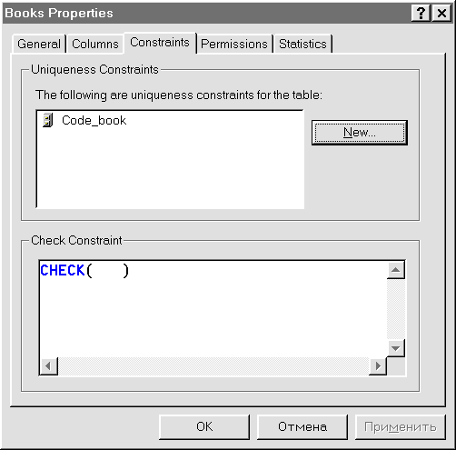 Рис. 53. Окно свойств таблицы Books - вкладка Constraints ПРИМЕЧАНИЕ В одной таблице данных может быть определено несколько групп полей с признаками уникальности значений. В каждой такой группе совокупность значений составляющих ее полей должна быть уникальной. В поле области Uniqueness Constraints данной вкладки отображаются группы полей таблицы с признаками уникальности значений. Для таблицы Books уникальность значений установлена только для одной группы. Она состоит из одного поля Code_book и была автоматически сформирована при определении этого поля первичным ключом таблицы. Для формирования новой группы следует воспользоваться кнопкой New. При этом открывается окно Add Uniqueness Constraint. Оно имеет точно такой же вид как и вкладка Columns (см. рис. 52). В утилите ISQL для добавления/удаления совокупности полей с признаком уникальности необходимо выполнить SQL-операторы вида: /* Добавления новой совокупности полей с признаком уникальности /* ALTER TABLE Stepanov.Books ADD UNIQUE(City_publish,"Publisher"); /* Удаление совокупности полей с признаком уникальности /* ALTER TABLE Stepanov.Books DELETE UNIQUE(City_publish, "Publisher") Поле области Check Constraint вкладки Constraints предназначено для задания условия накладываемые на значения таблицы. В утилите ISQL эти действия реализуются следующими операторами: /* Установка условий для значений таблицы */ ALTER TABLE Stepanov.Books ADD CHECK(Number>0 AND Start_date>=1992); /* Снятие условий для значений таблицы */ ALTER TABLE Stepanov.Books DELETE CHECK Назначение вкладки Permissions (рис. 54) состоит в установлении для пользователей привилегий по манипулированию текущей таблицей.