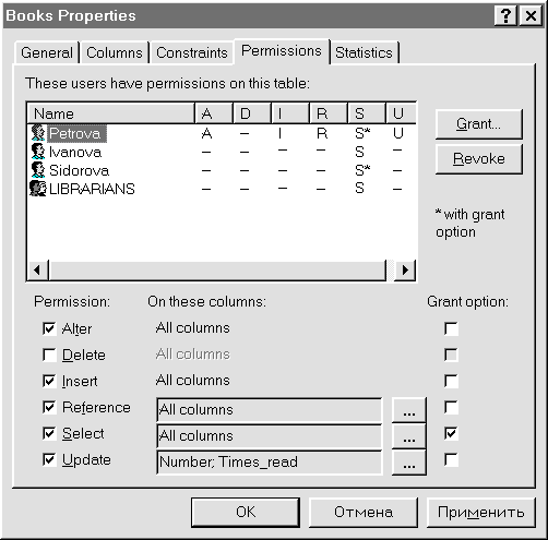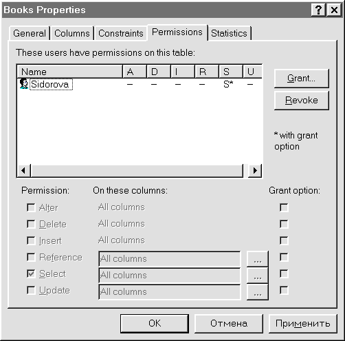 Рис. 54. Окно свойств таблицы Books - вкладка Permissions На вкладке Permissions показано, что пользователь Sidorova имеет привилегию SELECT (см. табл. 7) для таблицы Books (см.приложение). Причем он(она) имеет право предоставлять эту привилегию другим пользователям. Такие привилегии данному пользователю предварительно установил автор. Для предоставлении привилегий другим пользователям следует щелкнуть мышью по кнопке Grant.