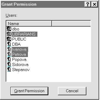 Рис. 55. Назначение пользователей, допущенных к работе с таблицей Books После этого необходимо выделить из предлагаемого списка требуемых отдельных пользователей или/и групп пользователей. Этим самым реализуется назначение индивидуальных или групповых привилегий. На рис. 55 показано выделение пользователей Ivanova, Popova и группы пользователей LIBRARIANS. После этого следует щелкнуть по кнопке Grant Permission. Результат допуска этих пользователей будет отображен в вкладке Permissions (рис. 56).