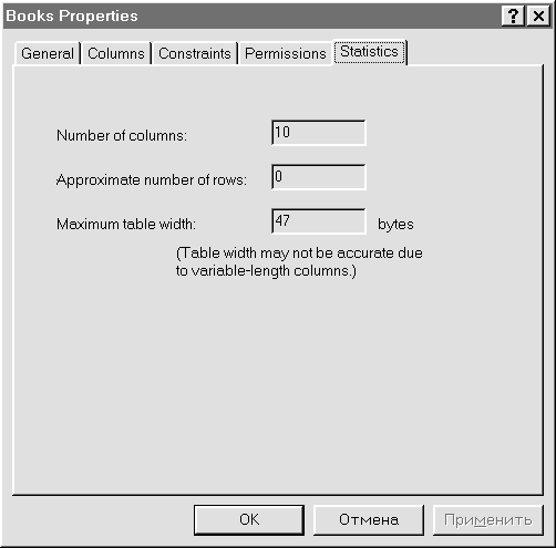 Рис. 57. Окно свойств таблицы Books - вкладка Statistics Вкладка Statistics показывает некоторые физические характеристики текущей таблицы. В поле Number of columns показано количество полей таблицы. Таблица Books состоит из 10 полей. Поле Approximate number of rows отображает примерное число записей таблицы. Таблица Books пока не содержит ни одной записи. В поле Maximum table width указывается максимальная длина записи в байтах. При этом размеры полей с перемененной длинной (см.табл. 8, 14) не учитываются. В утилите ISQL количество полей таблицы можно определить путем просмотра из перечня (см. рис. 22, 23). Количество записей в таблице можно определить при выполнении оператора SELECT. Оно отображается при этом в окне Statistics утилиты ISQL. Таким образом, совместно со свойствами полей, свойства таблицы представляют пользователям возможность хранить в базах данных информацию с широким спектром характеристик. Назад | Содержание | Вперед