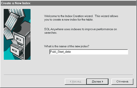 Рис. 58. Создание индекса таблицы данных Пояснение. Добро пожаловать в Мастер создания индексов. Этот Мастер позволяет вам создать новый индекс таблицы данных. Индексы, формируемые пользователями СУБД SQL Anywhere, предназначены для сокращения времени поиска данных. Вопрос. Какое имя вы хотите дать новому индексу? Ниже следует поле, в которое следует ввести имя создаваемого индекса. В нашем случае - это Publ_Start_date. После заполнения поля окна щелкните мышью по кнопке Далее для выполнения следующего шага. Шаг 2. Определение условия формирования индекса (рис. 59).