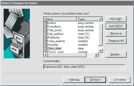 Рис. 59. Определение условия формирования индекса Вопрос. Какие поля будут использоваться при формирования индекса? В приведенном ниже списке полей таблицы необходимо выделить одно из полей щелкнуть мышью по одной из кнопок. Кнопка Add ASC позволяет включить в условие формирования индекса использование значений выделенного поля по возрастанию. Сделанный выбор отображается в окне Curent index. В случае необходимости использования значений выделенного поля по убыванию следует "нажать" на кнопку Add DESC. Кнопка Remove предназначена для исключения из индекса значений выделенного поля. Если требуется исключить из индекса все поля, воспользуйтесь кнопкой Remove All. Просмотреть свойства выделенного поля позволяет кнопка Details. На рис. 59 представлен результат выделения поля Publisher с последующим использованием кнопки Add ASC и выбора поля Start_date "иажатия" кнопки Add DESC. В результате этого будет сформирован индекс по возрастанию названий издательств (поле Publisher). В пределах одного издательства даты поступления книг в библиотеку будут отсортированы по убыванию. После задания условия формирования индекса переходим к следующему шагу при помощи кнопки Далее. Шаг 3. Выбор области базы данных (см.п. 1) для хранения индекса (рис. 60).