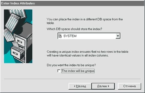 Рис. 60. Выбор области базы данных для хранения индекса Пояснение 1. Вы можете сохранить индекс в области базы данных отличной от той, где размещена таблица данных. Вопрос 1. В какой области базы данных следует сохранить индекс? Ниже следует список областей базы данных, в которых хранятся компоненты базы данных. По умолчанию индекс размещается в той же области, что и таблица данных. Пояснение 2. Формирование уникального индекса гарантирует, что в таблице не будет храниться двух записей с одинаковыми значениями полей, используемых при формировании индекса. Вопрос 2. Вы хотите, чтобы индекс был уникальным? Для ответа на этот вопрос предназначен флажок The index will be unique. В нашем случае это флажок должен находиться в сброшенном состоянии. Дело в том, что в один и тот же день в библиотеку могут поступить несколько книг одного издательства. По этой причине уникальность совокупности полей Publisher и Start_date не допустима. Теперь следует "нажать" кнопку Далее для подтверждения готовности к созданию нового индекса. Шаг 4. Подтверждение готовности к созданию нового индекса (рис. 61).
