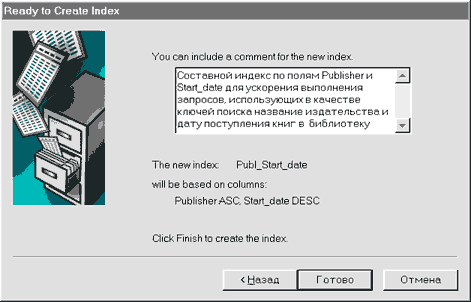 Рис. 61. Подтверждение готовности к созданию нового индекса Пояснение 1. Вы можете включить комментарий для нового индекса. Ниже располагается поле для ввода комментария для создаваемого индекса. Пояснение 2. Новый индекс Publ_Start_date будет сформирован по возрастанию значений поля Publisher и убыванию значений поля Start_date. Щелкните по кнопке Готово для завершения формирования индекса. Все действия, выполненные до сих пор в мастере Add index, были предназначены для определения параметров SQL-оператора CREATE INDEX. После щелчка мышью по кнопке Aioiai начнется выполнение этого оператора. Его результатом будет появление индекса Publ_Start_date. Данный факт выражается в появлении одноименного элемента в папке Indexes. (см. рис. 62).