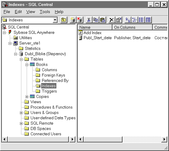 Рис. 62. Обновленное содержание папки Indexes ПРИМЕЧАНИЕ Независимо от того, кто создал индекс, его владельцем всегда объявляется владелец таблицы, для которой он создан. Для создания такого индекса Publ_Start_date в утилите ISQL требуется выполнить следующие SQL-операторы: