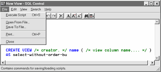 Рис. 70. Окно текстового редактора утилиты SQL Central с заготовкой (шаблоном ) оператора CREATE VIEW Для формирования заготовки в полноценный оператор необходимо в соответствии с подсказами добавить название представления, необязательные наименования полей и имя владельца представления, а также базовый оператор SELECT. На рис. 70 окно текстового редактора утилиты приведено с выпадающим меню File. Это связано с тем, что пункты этого меню наиболее часто используются при работе с текстовым редактором. Последний используется при работе с хранимыми процедурами, триггерами и представлениями. Рассмотрим назначение пунктом этого меню. При выборе пункта Execute Script осуществляется синтаксическая проверка операторов, содержащихся в окне. Без ее положительных результатов содержимое окна невозможно записать в базу данных. Использование пункта Save To File позволяет записать содержимое окна в файл. Считывание файла в окно редактора производится при помощи пункта Open From File. Пункт Print предназначен для печати содержимого окна, а пункт Close - для выхода из редактора. Кроме шаблона, в утилите SQL Central для создания представления может применяться еще и соответствующий мастер Add View(Wizard). Рассмотрим шаги, которые предлагает выполнить этот мастер. Шаг 1. Начальная стадия создания представления (рис. 71).