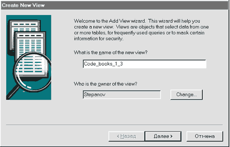 Рис. 71. Создание представления Пояснение. Добро пожаловать в Мастер создания представлений. Этот Мастер позволяет вам создать новое представление. Представления - это объекты, осуществляющие выборку данных из одной или большего числа таблиц. Они могут применяться для выполнения часто используемых запросов или для скрытия определенной информации для обеспечения режима секретности. Вопрос 1. Какое наименование вы хотите определить для нового представления? Ниже следует поле, в которое следует ввести имя создаваемого представления. В нашем случае - это Code_books_1_3. Вопрос 2. Кто будет владельцем представления? В поле окна, расположенном ниже вопроса отображается имя пользователя владельца создаваемого представления. По умолчанию это имя пользователя создающего представление. Для изменения имени владельца следует воспользоваться кнопкой Change. После щелчка мышью по этой кнопке пользователю предоставляется полный список всех зарегистрированных пользователей базы данный, среди следует осуществить выбор. После заполнения полей окна "нажмите" на кнопку Далее для выполнения следующего шага. Шаг 2. Выбор таблиц данных, используемых в представлении (рис. 72).
