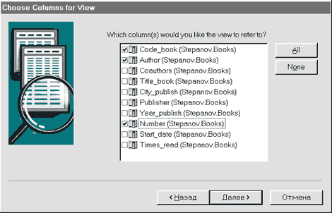 Рис. 72. Выбор таблиц данных, используемых в представлении Вопрос. На базе каких таблиц будут формироваться данные представления? Ниже приводится полный перечень таблиц базы данных. Их выбор определяется при помощи флажков. Кнопка All позволяет установить все флажки, т. е. осуществить выбор всех таблиц. Кнопка None предназначена для сброса всех установленных флажков, т. е. отмены ранее произведенного выбора. В нашем случае база данных Dubl_Biblia содержит всего две таблицы данных. Для создаваемого представления требуется только таблица Stepanov.Books, выбор которой отмечен установленным флажком. Произведя выбор таблицы, щелкните мышью по кнопке Далее для перехода к очередному шагу. Шаг 3. Выбор полей таблиц данных, на базе которых формируется представление (рис. 73).