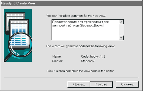 Владелец Stepanov Щелкните по кнопке Готово для завершения формирования текста представления в редакторе. После "нажатия" на эту кнопку мастер сформирует заготовку оператора CREATE VIEW и отобразит ее в окне текстового редактора утилиты (рис. 75).