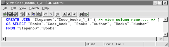 Рис. 75. Отображение заготовки CREATE VIEW в окне текстового редактора утилиты SQL Central Откорректируем текст заготовки в части базового оператора. Тогда окончательный текст оператора CREATE VIEW примет следующий вид: //Окончательный текст оператора CREATE VIEW CREATE VIEW Stepanov.Code_books_1_3 AS SELECT Books.Code_book, Books.Author, Books.Number FROM Stepanov.Books WHERE Code_book>=1 AND Code_book<=3 Проверим текст оператора на синтаксис при помощи команды меню File|Execute Script. После ее успешного окончания выходим из текстового редактора. В результате в базе данных появляется новое представление Code_books_1_3. Данный факт выражается в появлении одноименного элемента в папке Views. (см. рис. 76).