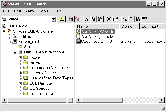 Рис. 76. Обновленное содержание папки Views Для создания представления Code_books_1_3 в утилите ISQL необходимо выполнить оператор CREATE VIEW окончательного вида, приведенный выше. Убедиться в появление нового представления можно, просмотрев список имеющихся в базе данных таблиц и представлений. Он появляется на экране после нажатия на клавишу F7 (см. рис. 22). Другим способом проверки наличия в базе данных нового представления является анализ содержимого системного представления SYS.SYSVIEWS. Текст оператора CREATE VIEW можно получить, выполнив следующие SQL-операторы: //Получение текста представления SELECT Viewtext //поле Viewtext содержит текст представления FROM SYS.SYSVIEWS WHERE Viewname = 'Code_books_1_3' //названия представления /*AND Vcreator = 'Stepanov' ; */ /* если имя представления не уникально, то требуется указать имя его владельца */ //оператор экспорта результатов оператора SELECT OUTPUT TO d:\Log_db\viewtext.sql /* полное имя файла куда осуществляется экспорт текста представления */ FORMAT /* в формате */ ASCII ПРИМЕЧАНИЕ При выполнении оператора OUTPUT в формате ASCII все переводы на новую строку исходного текста в формируемый текстовый файл записываются в виде последовательности символов \X0D\X0A. В SYBASE SQL Anywhere представления создаются оператором CREATE VIEW. Для последующей изменения текста представлений применяется оператор ALTER VIEW. Он заменяет в существующим представлении текст базового оператора. В утилите ISQL в операторе ALTER VIEW каждый раз приходится вводить текст базового оператора. В утилите SQL Central полный текст оператора ALTER VIEW выводится в окне текстового редактора утилиты после двойного щелчка мыши по пиктограмме представления (см. рис. 76). В этом случае текст можно отредактировать, используя возможности текстового редактора. Использовать представления имеют право: