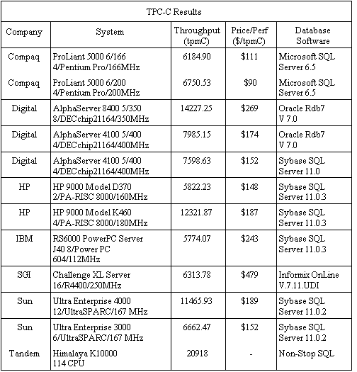 Среди этих пяти типов транзакций по крайней мере 43%должны составлять платежи. Транзакции, связанные со справками о состоянии заказов, состоянии поставки и учета, должны составлять по 4%. Затем измеряется скорость транзакций по новым заказам, обрабатываемых совместно со смесью других транзакций, выполняющихся в фоновом режиме. База данных TPC-C основана на модели оптового поставщика с удаленными районами и товарными складами. База данных содержит девять таблиц: товарные склады, район, покупатель, заказ, порядок заказов, новый заказ, статья счета, складские запасы и история. Обычно публикуются два результата (таблица 3.1.). Один из них, tpm-C, представляет пиковую скорость выполнения транзакций (выражается в количестве транзакций в минуту). Второй результат, $/tpm-C, представляет собой нормализованную стоимость системы. Стоимость системы включает все аппаратные средства и программное обеспечение, используемые в тесте, плюс стоимость обслуживания в течение пяти лет.