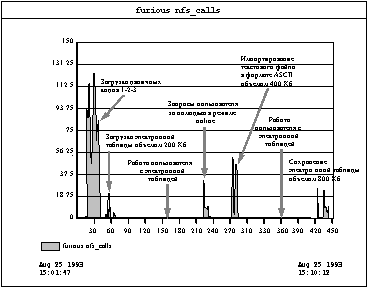 Характер рабочей нагрузки NFSЕсли бы клиенты NFS постоянно выполняли запросы к серверам (или сетям), то в конфигурацию системы пришлось бы включить огромное число выделенных сетей Ethernet или большое число высокоскоростных сетей типа FDDI или FastEthernet. К счастью, обычно трафик NFS имеет достаточно взрывной характер. Клиенты могут выполнять интенсивные запросы к файл-серверам или сетям, но периоды такой интенсивной работы возникают довольно случайно и относительно не очень часто. "Полностью активные" клиентыВсе остальное время клиенты генерируют либо небольшое число запросов, либо вообще обходятся без них. Везде далее по тексту мы будем называть клиента, который активно выполняет запросы, полностью активным клиентом. По разным причинам многие клиенты (в ряде случаев таковыми оказывается подавляющее большинство клиентов) часто оказываются не очень занятыми, тем самым не очень нагружая, либо вообще не нагружая свой сервер. Например, некоторые клиенты работают на достаточно мощных системах и могут кэшировать большинство, либо все свои данные. Другие системы используются только часть рабочего времени, и даже интенсивно используемые клиенты часто остаются полностью свободными в то время, когда их владельцы обедают или находятся на совещаниях. Типовой пример использования NFSВ конце концов примеры использования большинства приложений показывают, что клиенты нагружают сервер очень неравномерно. Рассмотрим работу с типичным приложением. Обычно пользователь должен прежде всего считать двоичный код приложения, выполнить ту часть кода, которая отвечает за организацию диалога с пользователем, который должен определить необходимый для работы набор данных. Затем приложение читает набор данных с диска (возможно удаленного). Далее пользователь взаимодействует с приложением манипулируя представлением данных в основной памяти. Эта фаза продолжается большую части времени работы приложения до тех пор, пока в конце концов модифицированный набор данных не запишется на диск. Большинство (но не все) приложения следуют этой универсальной схеме работы, часто с повторяющимися фазами. Приведенные ниже рисунки иллюстрирую типичную нагрузку NFS.