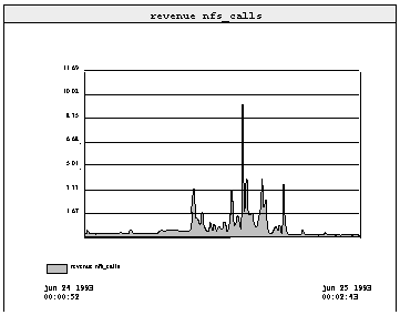 На рисунке 4.2 показан фрагмент журнала SunNetManager для ПК 486/33, работающих под управлением MS-DOS. Взрывной характер нагрузки клиентов проявляется очень отчетливо: в короткие промежутки времени видны пики, достигающие 100 операций в секунду, но средняя нагрузка невелика - 7 операций в секунду, а типичная нагрузка возможно составляет около 1 операции в секунду. Этот график снимался с интервалом измерений в одну секунду, чтобы просмотреть скорость транзакций при мелкой грануляции.