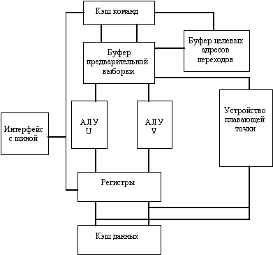Блок-схема процессора Pentium представлена на рисунке 6.1. Прежде всего новая микроархитектура этого процессора базируется на идее суперскалярной обработки (правда с некоторыми ограничениями). Основные команды распределяются по двум независимым исполнительным устройствам (конвейерам U и V). Конвейер U может выполнять любые команды семейства x86, включая целочисленные команды и команды с плавающей точкой. Конвейер V предназначен для выполнения простых целочисленных команд и некоторых команд с плавающей точкой. Команды могут направляться в каждое из этих устройств одновременно, причем при выдаче устройством управления в одном такте пары команд более сложная команда поступает в конвейер U, а менее сложная - в конвейер V. Такая попарная выдача команд возможна правда только для ограниченного подмножества целочисленных команд. Команды арифметики с плавающей точкой не могут запускаться в паре с целочисленными командами. Одновременная выдача двух команд возможна только при отсутствии зависимостей по регистрам. При остановке команды по любой причине в одном конвейере, как правило останавливается и второй конвейер. Остальные устройства процессора предназначены для снабжения конвейеров необходимыми командами и данными. В отличие от процессоров i486 в процессоре Pentium используется раздельная кэш-память команд и данных емкостью по 8 Кбайт, что обеспечивает независимость обращений. За один такт из каждой кэш-памяти могут считываться два слова. При этом кэш-память данных построена на принципах двухкратного расслоения, что обеспечивает одновременное считывание двух слов, принадлежащих одной строке кэш-памяти. Кэш-память команд хранит сразу три копии тегов, что позволяет в одном такте считывать два командных слова, принадлежащих либо одной строке, либо смежным строкам для обеспечения попарной выдачи команд, при этом третья копия тегов используется для организации протокола наблюдения за когерентностью состояния кэш-памяти. Для повышения эффективности перезагрузки кэш-памяти в процессоре применяется 64-битовая внешняя шина данных. В процессоре предусмотрен механизм динамического прогнозирования направления переходов. С этой целью на кристалле размещена небольшая кэш-память, которая называется буфером целевых адресов переходов (BTB), и две независимые пары буферов предварительной выборки команд (по два 32-битовых буфера на каждый конвейер). Буфер целевых адресов переходов хранит адреса команд, которые находятся в буферах предварительной выборки. Работа буферов предварительной выборки организована таким образом, что в каждый момент времени осуществляется выборка команд только в один из буферов соответствующей пары. При обнаружении в потоке команд операции перехода вычисленный адрес перехода сравнивается с адресами, хранящимися в буфере BTB. В случае совпадения предсказывается, что переход будет выполнен, и разрешается работа другого буфера предварительной выборки, который начинает выдавать команды для выполнения в соответствующий конвейер. При несовпадении считается, что переход выполняться не будет и буфер предварительной выборки не переключается, продолжая обычный порядок выдачи команд. Это позволяет избежать простоев конвейеров при правильном прогнозе направления перехода. Окончательное решение о направлении перех