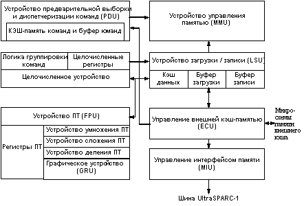 LSU отвечает за формирование виртуального адреса для всех команд загрузки и записи (включая атомарные операции), за доступ к кэш-памяти данных, а также за буферизацию команд загрузки в случае промаха D-кэша (в буфере загрузки) и буферизацию команд записи (в буфере записи). В каждом такте может выдаваться для выполнения одна команда загрузки и одна команда записи. Устройство плавающей точки (FPU) Конвейерное устройство плавающей точки процессора UltraSPARC построено в соответствии со спецификациями архитектуры SPARC-V9 и стандарта IEEE 754. Оно состоит из пяти отдельных функциональных устройств и обеспечивает выполнение операций с плавающей точкой и графических операций. Реализация раздельных исполнительных устройств позволяет UltraSPARC-1 выдавать и выполнять две операции ПТ в каждом такте. Операнды-источники и результаты операций хранятся в регистровом файле емкостью 32 регистра. Большинство команд полностью конвейеризованы (имеют пропускную способность 1 такт), задержку в 3 такта и не зависят от точности операндов (имеют одну и ту же задержку для одинарной и двойной точности). Команды деления и вычисления квадратного корня не конвейеризованы и выполняются 12/22 такта (одинарная/двойная точность), но не останавливают процессор. Другие команды, следующие за командами деления/вычисления квадратного корня, могут выдаваться, выполняться и изыматься из обработки для фиксации результата в регистровом файле до завершения команд деления/вычисления квадратного корня. Процессор поддерживает модель точных прерываний посредством синхронизации конвейера плавающей точки с целочисленным конвейером, а также с помощью средств прогнозирования исключительных ситуаций для операций с большим временем выполнения. FPU может работать с нормализованными и ненормализованными числами с одинарной (32 бит) и двойной точностью (64 бит), а также поддерживает операции над числами с учетверенной точностью (128 бит). FPU тесно взаимодействует с целочисленным конвейером и способно без каких-либо дополнительных задержек выполнять чтение операнда с ПТ из памяти и следующую за ней операцию ПТ. IEU и FPU имеют выделенный интерфейс управления, который обеспечивает диспетчеризацию операций, выбранных PDU в FPU. Устройство предварительной выборки и диспетчеризации команд выполняет распределение находящихся в очереди команд в FPU. IEU управляет частью операций, связанных с D-кэшем, а FPU выполняет собственно операции обработки данных. При выполнении команд ПТ целочисленное устройство и FPU совместно определяют наличие зависимостей по данным. Существующий между ними интерфейс включает также взаимную синхронизацию при появлении исключительных ситуаций FPU. Для снижения взаимного влияния и увеличения общей производительности в FPU обеспечивается дополнительная буферизация команд ПТ, реализованная с помощью очереди на три команды. Графическое устройство (GRU) В процессоре UltraSPARC-1 реализован исчерпывающий набор графических команд, которые обеспечивают аппаратную поддержку высокоскоростной обработки двухмерных и трехмерных изображений, обработку видеоданных и т.д. GRU выполняет операции сложения, сравнения и логические операции над 16-битовыми и 32-битовыми целыми числами, а также операции умножения над 8-битовыми и 16-битовыми целыми. В GRU поддерживаются однотактные операции определения р