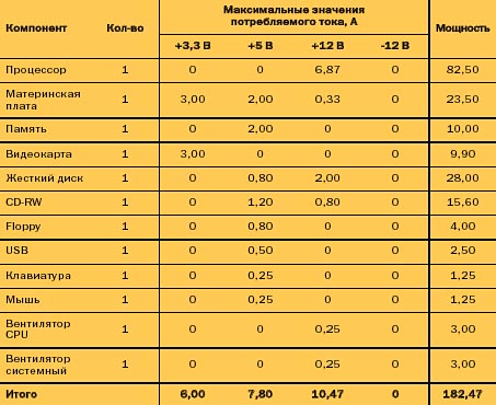 Не поленитесь, просчитайте заранее, сколько жестких дисков будет установлено в корпус, достаточно ли вам одного CD-привода, не понадобится ли дополнительное гнездо под установку трехдюймового накопителя ZIP-drive или флэш-ридера. Все это неизбежно повлияет на выбор корпуса. Никогда не забывайте о конечной цели. То есть, если компьютер будет использоваться, например, в качестве рабочей станции, то стоило бы предпочесть такой корпус, у которого на передней панели присутствуют разъемы USB и аудио. Кроме того, в ряде случаев может потребоваться установка инфракрасного излучателя. А вот серверная конфигурация может потребовать установки дополнительного блока питания. Кстати, БП — это тема для отдельного разговора. Вот к ней и перейдем. Выбор блока питанияНадежная и стабильная работа вашей системы напрямую зависит от грамотного подбора блока питания. Существует масса рекомендаций по этому поводу, мы же ограничимся лишь необходимым минимумом информации. Прежде всего, стоит определиться с термином "потребляемая мощность". К сожалению, слишком уж часто приходится слышать мнение "250 Вт хватит для любой конфигурации!". Мало кто дает себе отчет в том, что все не так просто, как кажется. Я, к примеру, могу сходу назвать конфигурацию современного высокопроизводительного ПК, при которой потребуется источник питания не менее 500 Вт. Более грамотные (читай — уже наступившие на эти грабли) специалисты рекомендуют подсчитать максимальную мощность, потребляемую всеми устройствами в системе — и, исходя из этого, брать источник питания "с запасом". Чтобы уж наверняка хватило. К сожалению, такой подход тоже в корне неверен — обычно такую рекомендацию дают те, кто хочет обезопасить себя от возможных последствий, но не желает слишком утруждать себя расчетами. Человек, претендующий на роль профессионала, так не поступит. Хотя предпосылка вполне правильная, не стоит забывать — это лишь верхушка айсберга. На самом деле расчет потребляемой мощности ведется, прежде всего, исходя из целевого предназначения компьютера. Итак, сформулируем главную аксиому: Для надежной работы системы выходная мощность источника питания должна превышать суммарную максимальную мощность, необходимую для планируемой системы Не стоит бросать в меня тяжелым и корявым предметом. Ключевое слово в данной фразе — "планируемой". Дело в том, что планируемая максимальная потребляемая мощность всегда будет меньше, чем суммарная максимальная потребляемая мощность. Причина такого "нонсенса" в том, что вероятность одновременного использования всех компонент по максимуму весьма близка к нулю. В качестве домашнего задания можете прикинуть, какие компоненты больше всего нагружены в процессе работы у игрового ПК. Как же все-таки правильно рассчитать необходимую мощность? В принципе, однозначной рекомендации тут нет. Я лично придерживаюсь следующей последовательности.