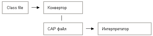 В этом языковом ограничении возможны вариации. Так, например, на некоторых устройствах поддерживается сборка мусора. Java Card Virtual MachineОсновное отличие от обычной виртуальной машины Java заключается в том, что JCVM представляет собой набор из двух компонент: то, что находится на самой карте (интерпретатор) и то, что находится вне карты (конвертор). Рабочий цикл может быть проиллюстрирован следующим рисунком: