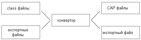 В качестве входной информации конвертор может также использовать экспортные файлы. Это происходит в том случае, если конвертируемый пакет импортирует классы из других пакетов. В этом случае эти пакеты будут представляться для контейнера своими экспортными файлами. Как уже отмечалось выше, помимо собственно CAP файла, конвертор создает экспортный файл для всего пакета. Общая схема иллюстрируется следущим рисунком: