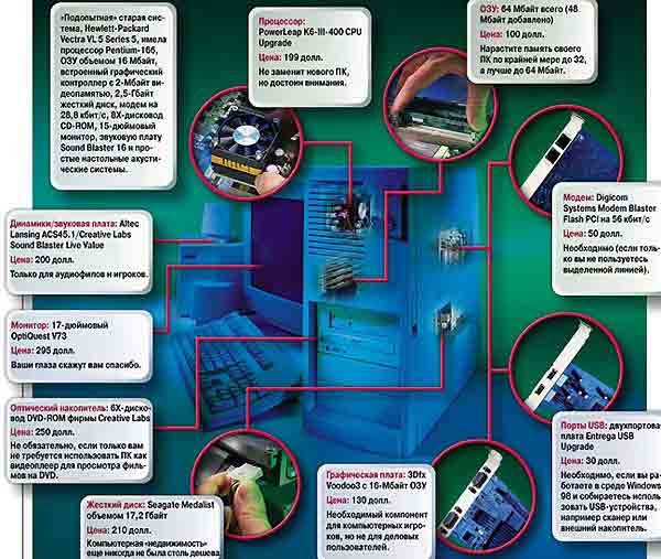 МодернизацияМИР ПК #12/99 Стэн Мястковски и Ануш Егиазарян Имеет ли смысл сегодня, когда компьютеры стали совсем недорогими, заниматься капитальным ремонтом старого ПК? Прочитав данную статью, вы сможете найти ответ на этот вопрос. Вспомните не столь далекое прошлое. Вы только что выложили больше 2 тыс. долл. за новенькую машину с последними технологическими достижениями: стремительным 166-МГц процессором Pentium, просторным 16-Мбайт ОЗУ и жестким диском громадной вместимости - 2 Гбайт. Конечно, покупка обошлась вам недешево, но вы приобрели самый мощный ПК, о котором можно было только мечтать. А теперь давайте вернемся в наши дни. При взгляде на тот же компьютер на ум придут следующие определения: медленный, тесный, функционально бедный. Иными словами, вашей морально устаревшей машине не хватает мощности, чтобы справиться с современными требовательными к ресурсам программами, не говоря уже про еще более "прожорливую" систему Windows 2000. Более того, компьютерные магазины почти даром предлагают новые системы, за которыми вашей ни за что не угнаться. Так стоит ли сейчас, в эпоху столь недорогих новых ПК, заботиться о модернизации еще работающего? Прежде всего, следует отметить, что в настоящий момент выгодно покупать как новые машины, так и продукты для модернизации. Кроме того, учтите, "компьютер вашей мечты" может обойтись вам в 1,5-2 тыс. долл. или даже дороже. Наиболее совершенные системы, оснащенные самыми быстрыми процессорами и обладающие обилием функциональных возможностей, даже сегодня не назовешь общедоступными по цене. Таким образом, одним из вариантов получения хорошего ПК может стать модернизация уже имеющегося, нужно лишь правильно выбрать нужные компоненты. Потратив некоторую сумму на требующиеся детали, вы сможете на год-два продлить жизнь своему старому компьютеру, пока не появятся более мощные и дешевые новые машины, перед которыми устоять будет гораздо труднее. Впрочем, смотрите не перестарайтесь. Общее правило таково: если за год дополнительной эксплуатации ПК вам придется заплатить больше 400 долл. или установить в систему более трех компонентов, в этом случае, возможно, не имеет смысла тратить время и деньги на модернизацию. (Это относится только к внутренним компонентам, например, к процессору, ОЗУ или жесткому диску, а не к таким внешним периферийным устройствам, как мониторы, принтеры или сканеры. Это сопутствующее компьютеру оборудование без особого труда совмещается с любой новой системой.) Следовательно, правильная модернизация требует обдумывания и планирования. В этом обзоре затронуты основные вопросы, касающиеся обновления компонентов системы, начиная с ОЗУ и процессора и заканчивая устройствами хранения информации, модемами и новомодными портами USB и IEEE 1394. Вы сумеете разобраться, когда имеет смысл сделать какое-либо из этих обновлений, а когда нет. Отвертку приготовили? Тогда поехали. Обновление ОЗУ и ЦПЕсли ваша цель - выжать максимум производительности из устаревающего компьютера, наиболее эффективной модернизацией будут наращивание памяти и замена центрального процессора. Модули ОЗУ недороги* и просты в установке. От вас не потребуется никаких особых навыков, чтобы нарастить память до приемлемого для работы с Windows 98 или Office 2000 значения - 64 Мбайт. В зависимости от типа модулей, объема и производителя це