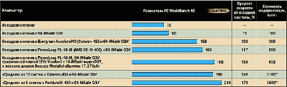 * HP Vectra VL 5 Series 5 с процессором Pentium-166, 16-Мбайт ОЗУ, встроенным графическим адаптером с 2-Мбайт видеопамятью и 2,5-Гбайт жестким диском с интерфейсом EIDE; работает под управлением Windows 95. Впрочем, если вы подумываете о переходе на платформу Windows 2000, то 128 Мбайт памяти вам не помешают. В тестовой лаборатории журнала PC World пока не проводились испытания на производительность в среде этой новой ОС, однако известно, что у нее лучше, чем у Windows 95 и 98, реализовано управление памятью, и потому объемы свыше 64 Мбайт будут использоваться более эффективно (при этом, конечно, имеется в виду, что ваш ПК выполнен на базе набора микросхем, отличного от вышеперечисленных). Но одно лишь наращивание ОЗУ вряд ли придаст вашей старой системе мощность, необходимую для комфортной работы с Windows 2000, - для этого вам потребуется машина по крайней мере класса Pentium II. Кроме того, чем "древнее" ваш ПК, тем больше шансов, что установленная в нем системная плата, видеоадаптер или другие компоненты окажутся не полностью совместимыми с новой ОС. Вывод: если вы собираетесь в ближайшее время перейти на Windows 2000, а ваш ПК для этого потребует существенной модернизации, видимо, все-таки самым мудрым решением будет покупка нового компьютера с предустановленной Windows 2000. Мне нужен новый мозгПродукты для модернизации процессора сегодня больше не являются высокопрофильными компонентами, как было в свое время при объявлении компанией Intel своих процессоров серии OverDrive. Тем не менее три поставщика - Evergreen Technologies, Kingston Technology и PowerLeap - предлагают изделия для модернизации процессоров на базе разных кристаллов, включая AMD K6-2 и K6-III, а также Intel Celeron. (В плату для Pentium нельзя установить ни процессор Pentium III, ни даже Pentium II, так как эти микросхемы выполнены в виде картриджей, несовместимых с гнездами для более ранних процессоров.) Хотя модернизация процессора и представляется весьма устрашающей операцией, на самом деле в большинстве случаев она ненамного сложнее наращивания ОЗУ. Впрочем, и тут уместно дать некоторые предостережения. Прежде всего, учтите, что здесь нет универсальной совместимости, когда один компонент подходит ко всем остальным. Перед покупкой продукта для модернизации процессора нужно зайти на Web-узел его поставщика и проверить, совместима ли данная микросхема с вашим ПК. Но даже тогда следует быть готовым к возникновению проблем. Например, и кристалл TurboChip 233 (149 долл.), и TurboChip 366 (209 долл.) фирмы Kingston отказались работать в тестовом компьютере HP Vectra Pentium-166. На Web-узле Kingston эта машина перечислена в списке несовместимых с изделием TurboChip 366, однако компания так и не смогла объяснить, почему не стала функционировать микросхема TurboChip 233. Если ваш ПК не желает работать с каким-то конкретным процессором для модернизации, вы можете попытаться "подружить" их, обновив записанную во флэш-ПЗУ системную BIOS. Версии BIOS по цене 60-70 долл., решающие многие проблемы несовместимости, предлагает фирма Unicore. Впрочем, имейте в виду, что в тех редких случаях, когда обновление BIOS заканчивается неудачно (например, если во время перепрограммирования ПЗУ пропадет электропитание), системная плата оказывается неработоспособной. Вернуть ее к жизни можно будет лишь установкой новой микросхемы с BIOS, причем денежные затраты на эту операцию не всегда входят в условия гарантийного обслуживания. Фокус с платой EvergreenНовый тип проду