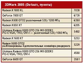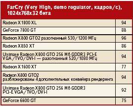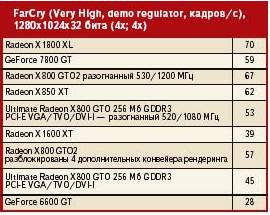 При условии использования Windows, создать соответствующую стартовую дискету труда не составит. Достаточно выбрать в опциях форматирования диска позицию "Создать стартовый диск системы MS-DOS". Затем на подготовленную таким образом дискету (читай — носитель) копируем файлы с программой Flashrom и новым BIOS. Ради пущей безопасности неплохо было бы туда же поместить и оригинальный BIOS карты. После запуска компьютера со стартового диска системы DOS (и перехода на соответствующий привод, где находятся необходимые для модификации файлы), в командной строке нужно вписать: flashrom -p -f 0 bios.bin где bios.bin — это название файла с BIOS для изменения. Через несколько секунд BIOS на карте будет заменен, и после перезагрузки можно пользоваться уже 16-конвейерным Radeon. Правильно ли была выполнена операция, подскажет программа ATI Tool. В закладке Overclocking находится информационная линейка Active pipelines. Если в ней обозначена цифра 16 — переработка прошла удачно. Если, как и прежде, видим "12" — карта переделке не поддалась. Впрочем, действуя согласно приведенных выше рекомендаций, вы вряд ли столкнетесь с неудачей. Быстрее — но насколько?Имея четыре дополнительных разблокированных потока рендеринга, мы, естественно, можем рассчитывать на улучшение результатов карты. При установке стандартных тактовых частот для процессора и памяти "скорострельность" значительно возрастет — но это далеко не все, на что способна модель Sapphire X800 GTO2. После первого этапа переделки нами получен примерно 14-процентный прирост в синтетических бенчмарках и вплоть до 36% прироста в играх. Но достаточно мощное охлаждение карты позволяет существенно повысить тактовую частоту процессора. Быстрая память, в свою очередь, обеспечивает собственный разгон. Экспериментируя с установками этих параметров в программе ATI Tool, удалось добиться, чтобы карта абсолютно стабильно работала в режиме (соответственно, тактовая частота ядра и памяти) 530 МГц и 600 МГц (эффективная — 1200 МГц). Признаемся, показатели выглядит очень привлекательно. Для сравнения: Radeon X850 XT работает с частотами 520 МГц и 540 МГц (эффективная — 1080 МГц). Так что нам удалось получить производительность за намного меньшую сумму. В конце концов, в синтетическом тесте 3DMark05 мы получили прирост производительности примерно 40%, а в играх — целых 67%! Чем выше производительность, тем внушительней прирост скорости. Результаты можно посмотреть в таблице. Тесты производительностиКонфигурация аппаратной платформы: