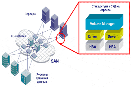 Рисунок 1. Инфраструктура системы хранения данных на основе SAN Из чего состоит система хранения данных?Для многих система хранения данных ассоциируется с устройствами хранения и, в первую очередь, с дисковыми массивами. Действительно, дисковые массивы сегодня являются основными устройствами хранения данных, однако, не стоит забывать, что обработка информации, формирование логической структуры ее хранения (дисковых томов и файловых систем) осуществляется на серверах. В процесс доступа к данным, (помимо процессоров и памяти сервера) вовлечены установленные в нем адаптеры (Host Bus Adapter — HBA), работающие по определенному протоколу, драйверы, обеспечивающие взаимодействие HBA с операционной системой, менеджер дисковых томов, файловая система и менеджер памяти операционной системы. Если дисковый массив выполнен в виде отдельного устройства, то для его подключения к серверам используется определенная инфраструктура. В зависимости от протокола доступа (транспорта), реализованного в HBA и дисковом массиве, она может быть простой шиной (как в случае с протоколом SCSI), так и сетью (как в случае с протоколом Fibre Channel (FC)). Если это сеть, получившая название "сеть хранения данных" (Storage Area Network — SAN), то, как и положено сети, в ней используется активное оборудование — концентраторы и коммутаторы, работающие по протоколу FC, маршрутизаторы протокола FC в другие протоколы (обычно в SCSI). Таким образом, помимо устройств хранения данных в состав СХД необходимо еще добавить инфраструктуру доступа, связывающую сервера с устройствами хранения. Отвечая на вопрос, где правильно провести черту, отделяющую систему хранения от серверного комплекса, предлагается рассматривать систему хранения данных как "черный ящик". Тогда, для подключения сервера к системе хранения, достаточно установить в сервер HBA с необходимым протоколом, подключить его к системе хранения и сервер сразу "увидит" свои данные — то есть по принципу "plug and play". Это идеальная ситуация, к которой IT-индустрия, возможно, придет в будущем. Сегодня границу, отделяющую систему хранения данных от серверов, надо проводить на самих серверах выше уровня менеджера дисковых томов. А почему именно так, можно убедиться на следующем примере: в системах, где требуется высокий уровень готовности, дисковый массив может считаться единой точкой отказа (Single Point Of Failure — SPOF). Для ликвидации SPOF обычно устанавливается второй массив, при этом данные зеркалируются на оба массива. Сегодня одним из самых распространенных средств зеркалирования является менеджер дисковых томов (например, VERITAS Volume Manager). Таким образом, менеджер дисковых томов вовлечен в процесс обеспечения отказоустойчивости системы хранения данных и становится её компонентом. Сетевой инфраструктурой, объединяющей большое количество серверов и устройств хранения, необходимо управлять и, как минимум, отслеживать ее состояние. Сказанное не означает, что нет необходимости мониторинга состояния, например, двух серверов и одного массива, подключенного к ним напрямую. Однако, это можно реализовать подручными средствами — встроенными утилитами серверов, массива и операционной системы, бесплатными (freeware) утилитами или "самописными" скриптами. Каждое из устройств в СХД имеет несколько объектов, требующих управления и контроля состояния, например дисковые груп