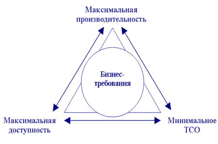 Рисунок 2. Конфликт целей Какие задачи надо решить проектировщику в процессе создания системы хранения данных?В процессе создания СХД необходимо достичь оптимального соотношения производительности, доступности (надежного хранения и отказоустойчивого доступа) и совокупной стоимости владения. Одним из наиболее часто используемых методов обеспечения высокой доступности СХД является дублирование, которое повышает стоимость системы. Если не учитывать бизнес-требований заказчика к доступности системы, то система становится неоправданно дорогой. Погоня за ненужной производительностью также приведет к использованию дорогих технических средств. Помимо высоких показателей производительности, доступности и низкой стоимости нужно также обеспечить требуемую функциональность — объем хранения и число подключаемых серверов. К сожалению, заказчики не всегда могут описать требования по производительности в количественных характеристиках, принятых для систем хранения — пропускной способности (Мбайт/с) или производительности (операций ввода-вывода в секунду — I/O per second (IOPS)). Поэтому, чтобы определить если не количественные характеристики, то хотя бы характер нагрузки, проектировщику необходимо выяснить, работу каких приложений должна обеспечивать СХД. Различные классы приложений создают разную нагрузку на дисковую подсистему. Например, для СУБД характерны виды нагрузок, зависящие от классов задач — транзакционные системы (Online Transaction Processing (OLTP)) и аналитические системы (Decision Support Systems (DSS)). Для задач класса OLTP характерным является большой поток запросов на ввод-вывод небольших порций данных. Для задач класса DSS, напротив, характерно небольшое число запросов на чтение больших порций информации. От того, какую нагрузку дает приложение, зависит выбор способа распределения данных по дискам и определение объема кэш-памяти дискового массива. Так для OLTP-задач наличие кэш-памяти в дисковом массиве может сыграть существенную роль для повышения производительности ввода-вывода. Напротив, в задачах класса DSS происходит считывание больших объемов данных, что практически исключает их повторное попадание в кэш-память (в отличие от OLTP-задач). Таким образом, кеширование считываемых данных при обработке DSS-задач не всегда увеличивает их производительность.