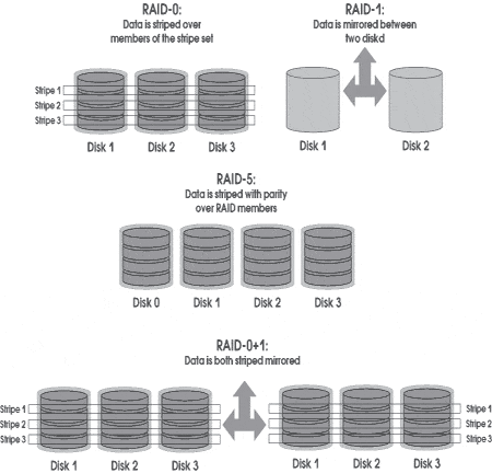 Рисунок 3. Уровни RAID К типам нагрузки на СХД, производимыми задачами класса OLTP, DSS и файловыми сервисами можно отнести другие известные типы приложений. Так, почтовый сервис, построенный на базе MS Exchange или Lotus Domino, даёт сходную нагрузку на СХД, что и OLTP, поскольку указанные продукты построены на базе СУБД. Почтовый же сервис, основанный на sendmail, производит нагрузку на СХД, характерную для файловой системы с частым изменением метаданных. Средства резервного копирования выполняют последовательное чтение данных, подлежащих резервному копированию, что делает характер их операций схожим с DSS-задачами. Существует еще один, не упомянутый ранее, тип нагрузки, характерный для процессов журналирования. Примером могут служить записи журналов транзакций СУБД или журналов событий операционных систем. К этому классу также можно отнести задачи загрузки данных в БД или хранилище данных (Data Warehouse). Нагрузка, осуществляемая на СХД этим классом задач, аналогична нагрузке DSS только для операций записи. Здесь наличие кэш-памяти (на запись) в дисковом массиве не увеличивает производительности записи данных. Данный тезис необходимо пояснить. Обычно применение кэш-памяти на запись уменьшает время, которое сервер тратит на операцию записи и ожидание её завершения. Но при записи большого объема информации (загрузка данных в БД) или при записи данных, которые пишутся на новое место, таких как журнал транзакций, существует высокая вероятность возникновения ситуации, когда кэш-память на запись уже будет полностью занята, а новый записываемый блок не соответствует ни одному из уже присутствующих в кэш-памяти. В этом случае массиву придется освободить несколько блоков кэш-памяти, записав их содержимое на диски, прежде чем начать обработку поступившей операции. Определить классы задач, которые будет обслуживать СХД, необходимо не только для выработки политики работы с кэш, но также для распределения данных по дискам (disk layout). Для обеспечения надежного хранения информации диски организуются в уровни RAID 1, 0+1/1+0 или 5. Самым экономичным с точки зрения использования дополнительного (дублирующего) дискового пространства является уровень RAID 5. Однако производительность RAID 5 ниже, чем у RAID 1 или 0+1 при частых случайных изменениях данных, характерных для OLTP-задач, и высока при считывании данных, что характерно для DSS-задач. Также разные уровни RAID обеспечивают различные уровни отказоустойчивости дисковой памяти к сбоям отдельных дисков. Так RAID 5 не спасает от двух последовательных отказов дисков, впрочем, как и RAID 0+1, если это диски разных половин "зеркала". Наиболее отказоустойчивым является уровень RAID 1+0 (попарное "зеркалирование" дисков и затем их "striping(1)"), поэтому его рекомендуется применять для хранения критичных данных, например, журналов транзакций СУБД. Практика показывает, что для хранения файловых систем и данных DSS-задач достаточно использовать RAID 5. Однако, если файловая система часто изменяется как, например, в почтовых системах sendmail, то имеет смысл использовать журналированную файловую систему или файловую систему с отдельно хранимыми метаданными, например файловую систему Sun QFS. Тогда для хранения журналов или отдельных метаданных лучше применять RAID 1 или 1+0. (1) Striping — метод размещения данных на дисках, при котором последовательно идущие блоки данных, с