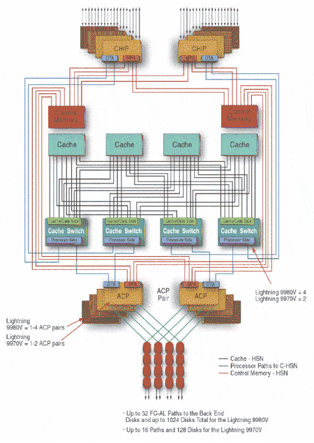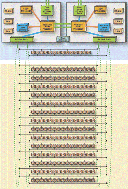 Рисунок 5. Типичная архитектура mid-range массива на примере HDS Thunder Для high-end массивов характерна коммутируемая или матричная архитектура(1) (Рис. 6). Очевидно, что в данной архитектуре нет "узких мест", тогда как в mid-range архитектуре узкими местами являются: контроллер, поскольку каждый контроллер обслуживает свои RAID-группы (набор дисков, на которых реализован один уровень RAID), шина между контроллерами, ограниченное число FC-AL петель к дискам, расположение дисков RAID-группы "вдоль" одной петли FC-AL. В high-end массивах RAID-группы располагаются "поперек" FC-AL петель. Например, в high-end массивах Hitachi RAID-группа состоит из 4-х или восьми дисков, где каждый диск подключается к двум различным петлям от двух различных дисков контроллеров. Такая конфигурация позволяет выполнять операции записи-чтения со всех дисков RAID-группы параллельно, чего нельзя добиться в mid-range массивах, когда диски одной RAID-группы расположены вдоль одной петли и доступ к ним осуществляется по очереди.