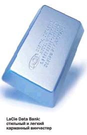 При наличии Sony Giga Vault можно некоторое время обойтись без источника питания. Согласно спецификации, встроенная батарея обеспечивает работоспособность жесткого диска в течение 1,5 ч. Эти диски выпускаются в двух модификациях — с интерфейсом USB 2.0 или FireWire. LaCie Data Bank напоминает небольшой слиток серебра. Это довольно медленное устройство, но зато единственный из рассмотренных жестких дисков, который легко помещается в кармане рубашки. ЗаключениеПользу от внешнего устройства для хранения данных объемом в полторы — две с половиной сотни гигабайт или портативного объемом в 40 Гб трудно приуменьшить. Правда, и цена таких дисков немаленькая. Однако если необходимо скопировать и перенести больше сотни гигабайт или ощутимо увеличить хранилище данных для ноутбука, то затраты могут себя оправдать. |
