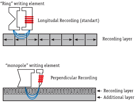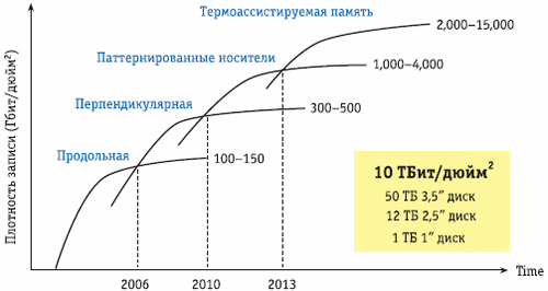Система IBM RAMAC состояла из 50-ти покрытых оксидом железа 24-дюймовых пластин, способных хранить 5 Мбайт информации Далее индустрия жестких дисков развивалась по экстенсивному пути: производители просто уменьшали размер битовых ячеек. Совершенствовались остальные компоненты накопителей — материал покрытия пластин, считывающая головка и электроника, однако сама технология записи принципиально не менялась. Такая ситуация не могла продолжаться вечно, поскольку при очень маленьких размерах ячеек вступали в силу квантовые эффекты, нехарактерные для классической физики. Понимание того, что для дальнейшего увеличения плотности необходимы новые технологии, пришло к разработчикам в XXI веке. Любая магнитная запись базируется на ферромагнитных свойствах некоторых веществ, способных сохранять намагниченное состояние в условиях отсутствия магнитного поля. В случаях, когда это состояние не сохраняется (или вероятность сохранения недостаточно высока), запись информации невозможна. Если же размер магнитного домена очень мал, возможно возникновение суперпарамагнитного эффекта, то есть несохранения намагниченного состояния в результате случайных движений частиц. Если вещество намагничено, его частицы имеют определенный магнитный порядок, устойчивость которого напрямую зависит от размеров домена. В то же время частицы вещества находятся в непрерывном движении, причем энергия этого движения пропорциональна температуре тела. Поэтому, если размер домена мал и энергия магнитного взаимодействия сравнима с температурной энергией, магнитный порядок может нарушиться в результате температурных флуктуаций. Последний тезис означает, что размер домена имеет определенный физический предел, дальнейшее уменьшение не имеет смысла. От чего же зависит этот предел? Прежде всего от температуры носителя — чем она меньше, тем меньше суперпарамагнитный эффект. Несмотря на теоретическую обоснованность, уменьшить температуру винчестеров на практике так же сложно, как и представить себе домашний компьютер с системой охлаждения, скажем, на жидком азоте. Поэтому методы, основанные на простом понижении температуры, вряд ли получат широкое распространение. Суперпарамагнитный предел существенно зависит и от свойств используемого вещества. Одной из характеристик магнетиков является константа магнитной анизотропии — величина, показывающая, какую (коэрцитивную) силу надо приложить к веществу для изменения его намагниченности. Чем больше эта сила, тем стабильнее ведет себя вещество и тем меньше его суперпарамагнитный предел. Однако применение веществ с высокой коэрцитивностью приводит к усложнению процесса записи, поскольку для этого надо приложить большую силу. Далее мы увидим, что один из «методов будущего» (а именно — термоассистирующая запись) базируется на изменении температуры тела и применении веществ с высокой коэрцитивностью. При использовании традиционной параллельной записи суперпарамагнитный эффект наступает при достижении плотности записи 100–150 Гбит/дюйм2, что соответствует емкости 500–750 Гбайт в случае 3,5-дюймовых жестких дисков. В прошлом году широкое распространение получила перпендикулярная запись, позволяющая несколько отодвинуть предел плотности. Поэтому, прежде чем рассказывать о будущих технологиях, остановимся н