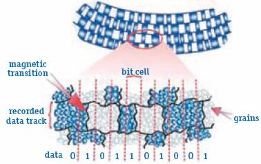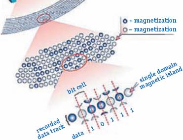 Схема. Параллельная и перпендикулярная запись Из школьного курса физики известно, что постоянные магниты, расположенные одинаковыми полюсами друг к другу, отталкиваются, а разными, наоборот, притягиваются. Как следствие, при использовании технологии последовательной записи возникают силы магнитного взаимодействия соседних доменов, влияющие на магнитные поля каждой из этих частиц. Другими словами, магнитная энергия каждого домена может уменьшиться, и тогда вероятность влияния термофлуктуаций на магнитный порядок данного домена увеличится. При использовании перпендикулярного расположения доменов их влияние друг на друга существенно уменьшается. Возникает естественный вопрос — почему же, несмотря на кажущуюся простоту и широкую известность метода, коммерческие реализации перпендикулярной записи появились спустя 50 лет после создания первого жесткого диска? Ответ на него можно разделить на две основные части. Во-первых, традиционная параллельная технология успешно развивалась и до недавнего времени не сталкивалась с жесткими физическими ограничениями. Во-вторых, техническая реализация перпендикулярной записи была сопряжена с рядом сложностей, обусловленных принципиально другим способом расположения магнитных доменов. Действительно, перпендикулярная запись требует наличия специальной дополнительной подложки под слоем записи, а также принципиально других, «двусторонних», головок, способных генерировать более сильное магнитное поле. Вполне возможно, перпендикулярная запись могла появиться и раньше, только производители не хотели осложнять себе жизнь и постепенно совершенствовали параллельную технологию, пока она не приблизилась к физическому пределу. По оценкам экспертов, современная технология перпендикулярной записи имеет физический предел плотности в 500 Гбит/дюйм2. Предполагается, что он будет достигнут в 2010 году. Таким образом, использование данного типа записи позволит довести емкость 3,5-дюймовых винчестеров до нескольких терабайт, а дальнейшее увеличение объема пока не представляется возможным. Сегодня видны два основных вектора развития индустрии жестких дисков — структурированная и термоассистирующая запись. Рассмотрим их подробнее. Структурированные носителиКонцептуальная идея структурированных носителей крайне проста, однако перспективы ее практической реализации до сих пор не понятны. Как видно из рис. 1, в современных накопителях каждый магнитный домен состоит из нескольких десятков (70–100) мелких структурных элементов («зерен»), каждое из которых теоретически способно выполнять функции домена и содержать в себе 1 бит информации.