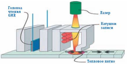 Рисунок 2. Структурированная запись В результате появляется возможность уменьшить суперпарамагнитный предел: увеличить размеры отдельного «зерна» и хранить единицу информации в меньшем количестве «зерен». Основная сложность внедрения структурированных технологий заключается в производстве требуемых носителей. Если плотность записи составляет 100 Гбит/дюйм2 (современные носители), то линейный размер одного «острова» (множества «зерен», хранящих 1 бит) должен равняться 86 нм, а для перехода к терабитным плотностям требуются «островки» длиной в 27 нм (квадрат линейного размера ячейки обратно пропорционален плотности — то есть при росте плотности вчетверо размер ячейки уменьшается вдвое). Таким образом, для того чтобы изготовить структурированные диски, требуется технология, способная наносить на поверхность носителя отпечатки столь малой длины. Значение 27 нм находится на пределе возможности оптической литографии — метода, применяющегося сегодня для изготовления микросхем и продуктов на их основе (например процессоров). Поэтому производители жестких дисков планируют применять другие литографические методы или использовать самоорганизующиеся материалы (примером подобного материала может послужить железо-платиновый сплав — FePt). Добавим, что материал носителя — не единственная проблема структурированной технологии, инженерам также придется разработать механизмы синхронизации магнитных импульсов головки и «островов», а также создать специальные навигационные метки для головки. В настоящее время разработки, связанные со структурированными носителями, ведут как минимум две лидирующие компании-производителя — Hitachi Global Storage Technologies (HGST) и Seagate. Причем первая из них возлагает на данный метод большие надежды. Согласно информации HGST, появление коммерческих структурированных носителей должно произойти в 2010 году, а предел их теоретической плотности может достигнуть отметки несколько терабит на квадратный дюйм. Если же разработчикам удастся придумать материалы с однозернистыми «островами», то возможны и вовсе фантастические результаты — с плотностью до нескольких десятков и даже сотен терабит. Термоассистируемая магнитная запись (Heat-Assisted Magnetic Recording, HAMR)Как мы уже отмечали выше, термоассистируемая запись сочетает два способа обхода суперпарамагнитного эффекта — с помощью изменения температуры и использования веществ с высокой коэрцитивностью. Подобные вещества стабильны, они имеют низкий суперпарамагнитный предел, однако для изменения их магнитного состояния (записи) требуется значительная коэрцитивная сила, которая не может создаваться современными головками. В технологии HAMR она и не создается — во время записи носитель нагревается, его коэрцитивность падает и требуемая сила становится гораздо меньше. После того как запись завершена, носитель остывает и остается в стабильном состоянии на долгое время (рис. 3).