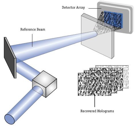 Схема 1. Принцип голографической записи В общих чертах принцип голографической записи InPhase Technologies выглядит достаточно просто (схема 1). Световой поток разделяется на два луча: сигнальный и референсный; сигнальный луч обеспечивает запись данных, референсный остается неизменным. Цифровые данные формируют «образ» сигнального луча при помощи специального устройства — пространственного светового модулятора (Spatial Light Modulator, SLM), который преобразует последовательность нулей и единиц, составляющих страницу данных, в массив черных и белых точек. Грубо говоря, создается подобие решетки, в которой просветы соответствуют очередной порции цифровых данных, а сквозь эту решетку просвечивает сигнальный луч, имеющий на выходе точную копию текущего состояния решетки в SLM. Разумеется, чем больше разрешающая способность пространственного светового модулятора, тем большую порцию данных может запечатлеть сигнальный луч в текущий момент времени, но на сегодня эта способность исчисляется миллионами битов. После преобразования в SLM уже несущий определенную информационную нагрузку сигнальный луч проецируется на физический носитель. В точку проекции направляется и референсный луч, пересекаясь в ней с сигнальным. В этот момент происходит химическая реакция и, как следствие, запись информации на носитель, причем там, где в SLM была непрозрачная точка. Отпечатка на носителе не остается, иначе соответствующая точка «выжигается». Если изменять длину волны референсного луча, угол его наклона или пространственное положение носителя, в один момент времени можно записать множество разных голограмм. Процесс записи данных на поверхности и в глубине носителя назвали мультиплексированием. Кстати, есть несколько способов выполнения мультиплексирования, например при помощи варьирования угла наклона референсного луча. К сожалению, неизвестно, какова степень мультиплексирования и как, например, «толщина» одной записанной голограммы соотносится с толщиной носителя, ведь, если предположить, что один молекулярный или атомарный слой соответствует одной голограмме, это могло бы стать настоящей революцией на рынке хранения данных.