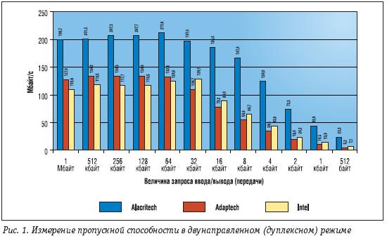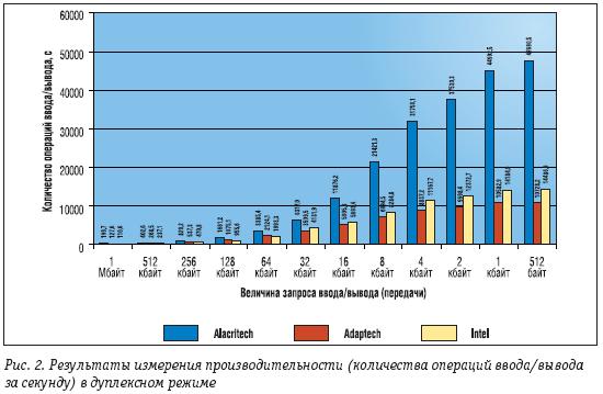 Представленные на рис. 2 результаты измерений в двунаправленном режиме свидетельствуют о том, что контроллер Alacritech выполняет больше операций ввода/вывода в единицу времени (за секунду), чем другие тестируемые контроллеры. Максимальное количество операций ввода/вывода за секунду для контроллера Alacritech составило 47690,5 при запросах передачи 512 байт. Максимальный показатель контроллера Adaptec составил 10728,2 при запросах передачи 512 байт. Еще меньший показатель у контроллера Intel – 14486,9 при запросах передачи 512 байт. С точки зрения пикового количества операций ввода/вывода за секунду контроллер Alacritech показал 345%-е превосходство над контроллером Adaptec и 226%-е превосходство над контроллером Intel.