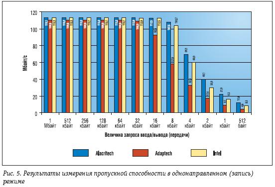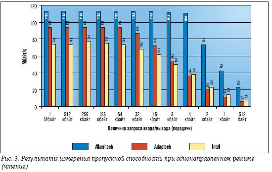 На рис. 3 представлены результаты измерения пропускной способности на операциях чтения в однонаправленном режиме. Видно, что максимальной пропускной способностью обладает контроллер Alacritech – 113,1 Mбайт/с (пиковая величина) при запросах передачи 256 кбайт. Самая маленькая в тесте пиковая пропускная способность 76,4 Mбайт/с при запросах передачи 256 кбайт оказалась у контроллера Intel, а пиковая пропускная способность контроллера Adaptec оказалась чуть выше 93,7 Mбайт/с при запросах передачи 512, 256, 128 и 64 кбайт. С точки зрения пропускной способности при однонаправленном режиме работы (чтении) преимущество контроллера Alacritech перед контроллером Intel составляет 48%, а перед контроллером Adaptec – 21%.