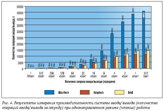 На рис. 4 показаны результаты измерения количества операций ввода/вывода за секунду в однонаправленном режиме (чтение) работы. Лучший результат (46001,5 операций ввода/вывода за секунду при запросе передачи 512 байт) снова показал контроллер Alacritech. На втором месте (14491,7 операций ввода/вывода за секунду при запросе передачи 512 байт) – контроллер Intel, а на третьем (11657,2 операций ввода/вывода за секунду при запросе передачи 512 байт) — контроллер Adaptec. С точки зрения количества операций ввода/вывода за единицу времени (то есть производительности системы ввода/вывода) преимущество контроллера Alacritech над контроллером Adaptec составляет 295%, а над контроллером Intel – 217%.