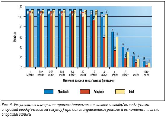 На рис. 5 представлены результаты измерения пропускной способности контроллеров при однонаправленном режиме работы и выполнении только операций записи. Лучший показатель (правда, с небольшим отрывом) — 113,2 Mбайт/с при запросах записи 512, 256, 128 и 64 кбайт снова у контроллера Alacritech. Самая маленькая пропускная способность 109,9 Mбайт/с при запросах записи 256, 128 и 64 кбайт у контроллера Adaptec. Пропускная способность контроллера Intel составляет 113,1 Mбайт/с при запросах записи 1 Mбайт, а также 512, 256, 128 и 64 кбайт. С точки зрения пропускной способности преимущество контроллера Alacritech над контроллером Adaptec составляет 3%. По сравнению с Intel разница совсем незначительна. Результаты измерения производительности системы ввода/вывода при однонаправленном режиме работы (количество операций ввода/вывода за секунду) и только на операциях записи представлены на рис. 6.