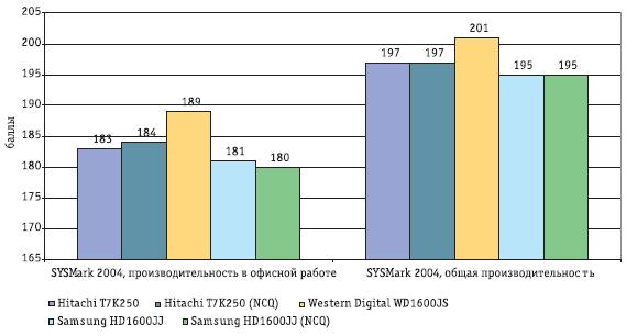 Диаграмма 2. Winstone 2004 РезультатыКак видим, в тесте SYSMark 2004 абсолютный чемпион - накопитель от Western Digital, причем конкурентам не помогла и технология Native Command Queuing. Такое ощущение, что WD либо правильно оценила возможности NCQ, либо просто довела до совершенства микропрограммное обеспечение своего винчестера.Аналогичная картина и в мультимедиатесте Multimedia Content Creation Winstone 2004, который предполагает перекачивание больших объемов данных. Диск WD демонстрирует минимальное преимущество, и интересно, что в ряде случаев применение NCQ негативно сказывается на результате. В бизнес-тесте Business Winstone 2004 победителем оказался диск Samsung. ВыводЕсли следить за разработками в сфере накопителей на жестких дисках, то заметно, что за последние несколько лет не было существенных технологических прорывов. Скорость вращения застыла на 7200 об/мин, поэтому прирост производительности за последние два года оказался очень скромным. Сегодня экономически выгодная модернизация устаревшей модели увеличит емкость, но вряд ли радикально скажется на производительности.Итак, даже SATA II предполагает лишь транспортировку данных по шине, начиная с буфера накопителя, а сам накопитель внутри может быть хоть 3-дюймовой дискетой. Необходим качественный скачок вперед - все замерли в ожидании новинок, в которых реализована технология перпендикулярной записи. |