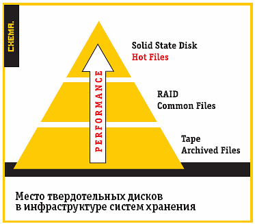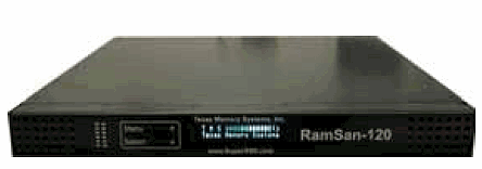 Разработанные относительно давно твердотельные (solid-state) диски как раз и предназначены для решения этих проблем, возникающих из-за нехватки производительности традиционных дисковых систем. Как и процессоры, твердотельные носители не имеют механических частей, а вся информация хранится в высокоскоростных микросхемах памяти. Конструктивно системы хранения данных на твердотельных дисках представляют собой массив оперативной памяти DDR RAM или SDRAM с соответствующей управляющей электроникой и специальный контроллер, позволяющий хост-системе "видеть" обычное дисковое устройство и формирующий логические номера устройств (Logical Unit Number - LUN). Сам массив памяти организован так, что при выходе из строя одной линейки не произойдет потери данных (как RAID 5 в обычных дисковых системах). Поскольку память SDRAM или DDR RAM не является энергонезависимой, предусмотрена еще одна батарея, которая будет питать память при незапланированном выключении основного электропитания (точно так же, как аварийное питание кэш-памяти обычных RAID-систем). Дополнительно (например, у систем Texas Memory Systems, торговая марка RamSan) может быть встроена система резервного копирования/восстановления на обычный жесткий диск с интерфейсом IDE. В этом случае в процессе выключения все содержимое твердотельного носителя переписывается на жесткий диск (их может быть несколько), а при включении - восстанавливается. В результате твердотельные носители способны поддерживать работу нескольких серверов. Латентность таких дисков измеряется микросекундами, а не миллисекундами, как у традиционных дисков. В то время как обычный диск может в среднем выполнить от 200 до 500 операций ввода/вывода за секунду, твердотельный диск более производителен и способен выполнить до 250000 произвольных операций ввода/вывода за секунду.