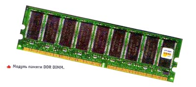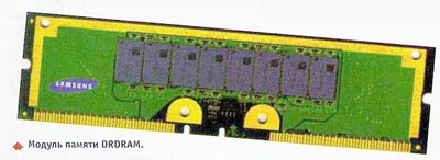 Рис. B.3.7. Модуль памяти DDR DRAM (SDRAM II) Спецификация SDRAM II (или DDR SDRAM) не имеет полной совместимости с SDRAM. Эта спецификация позволяет увеличить частоту работы SDRAM за счет работы на обеих границах тактового сигнала, то есть на подъеме и спаде. Однако SDRAM II использует тот же 168-ми контактный разъем DIMM. B.3.3.4. SLDRAM.Как и SDRAM II, эта спецификация использует обе границы тактового сигнала и имеет в себе SRAM. Однако благодаря протоколу SynchLink Interface эта память способна работать на частоте до 400 МГц. B.3.3.5. Память от Rambus (RDRAM, RIMM).