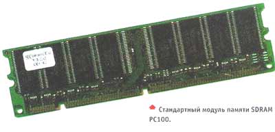 Рис. B.3.6. Модуль памяти SDRAM Аббревиатура SDRAM расшифровывается как Synchronic DRAM (динамическое ОЗУ с синхронным интерфейсом). Этим они отличаются от FPM и EDO DRAM, работающих по асинхронному интерфейсу. С асинхронным интерфейсом процессор должен ожидать, пока DRAM закончит выполнение своих внутренних операций. Они обычно занимают 60 нс. В DRAM с синхронным управлением происходит защелкивание информации от процессора под управлением системных часов. Триггеры запоминают адреса, сигналы управления и данных. Это позволяет процессору выполнять другие задачи. После определенного количества циклов данные становятся доступными, и процессор может их считывать. Таким образом, уменьшается время простоя процессора во время регенерации памяти. Другое преимущество синхронного интерфейса —это то, что системные часы задают временные границы, необходимые DRAM. Это исключает необходимость наличия множества стробирующих импульсов, обязательных для асинхронного интерфейса. Это, во-первых, уменьшает трафик по локальной шине (нет “лишних” сигналов), а во-вторых, позволяет упростить операции ввода-вывода (в операциях пересылки центральный процессор либо контроллер DMA уже не должен выделять полезную информацию среди служебных стробирующих импульсов и битов четности). В-третьих, все операции ввода/вывода на локальной шине стали управляться одними и теми же синхроимпульсами, что само по себе хорошо. Хотя SDRAM появилась уже давно, использование ее тормозилось высокой (на 33%) ценой по сравнению с EDO RAM. “Звездный час” SDRAM настал в 1997 году, после появления чипсета 440BX, работающего на частоте 100 МГц. Вследствие этого доля рынка SDRAM за год выросла в два раза (с 25% в 1997 году до 50% в 1998 году.) В настоящее время выпускаются модули SDRAM, работающие на частотах 100 и 133 МГц. Также разработаны SDRAM на частоты 143 МГц и выше. B.3.3.2. ESDRAM.Следующим оригинальным решением, увеличившим частоту работы SDRAM, явилось создание кэша SRAM на самом модуле динамического ОЗУ. Так появилась спецификация Enhanced SDRAM (ESDRAM). Это позволило поднять частоту работы модуля до 200 МГц. Назначение кэша на модуле точно такое же, что и кэш второго уровня процессора — хранение наиболее часто используемых данных. B.3.3.3. SDRAM II.