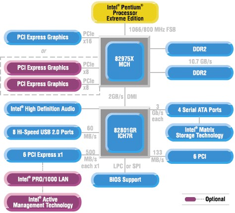Две платы — четыре турбиныЕвгений Рудометов"IT News" Один из методов снижения расходов на производство материнских плат — использование общего дизайна печатной платы для всего модельного ряда. Требуемое же разнообразие функциональных возможностей моделей достигается за счет применения в них разных наборов электронных компонентов, а также внесения соответствующих конструктивных изменений. В качестве примера использования общего дизайна в материнских платах можно привести модели линейки GA-G1975X компании Gigabyte — они принадлежат к изделиям ценовой группы High End и выпущены производителем на основе топового чипсета Intel 975X. Чипсет Intel 975XЧипсет поддерживает как традиционные модели Intel Pentium 4, Intel Pentium 4 Extreme Edition, так и двухъядерные Intel Pentium D и Intel Pentium Extreme Edition, включая варианты процессоров с реализацией технологии Hyper-Threading. Производителем заявлена поддержка i975X тактовых частот процессорной шины 266 или 200 МГц, что должно обеспечивать передачу данных и адреса соответственно на частотах 1066/800 МГц и 533/400 МГц. Использование чипсетом тактовых частот 133/100 МГц, обеспечивающих частоты передачи данных 533/400 МГц и адреса 266/200 МГц, формально не предусмотрено. Традиционно для современных наборов микросхем системной логики, чипсет i975X состоит из двух компонентов, называемых Memory Controller Hub (MCH) и I/O Controller Hub (ICH). В базовый комплект входят микросхемы Intel 82975X Memory Controller Hub (MCH) и Intel 82801GB (ICH7). В качестве второй микросхемы может использоваться улучшенный вариант ICH7, представленный микросхемой Intel 82801GR (ICH7R). Микросхемы MCH и ICH соединены специальной локальной шиной Direct Media Interface (DMI) со скоростью передачи данных до 2 Гбайт/с в каждом направлении. Обеспечивается полный дуплекс. Компонента MCH содержит в своем составе контроллеры, предоставляющие интерфейсы с высокой пропускной способностью. Эти контроллеры управляют системной шиной с передачей данных с частотой 800/1066 МГц и двух канальной оперативной памятью. В дополнение к этому они организуют работу графического интерфейса PCI Express x16 (до 8 Гбайт/с) для внешнего видеоадаптера или двух PCI Express x8 (до 2×4 Гбайт/с) для двух внешних видеоадаптеров, что не было предусмотрено у предшественника, i955X. Кроме того, встроенные в MCH контроллеры содержат средства связи с микросхемой ввода/вывода ICH. Интегрированный в микросхему Intel 82975X контроллер памяти предусматривает поддержку двух- или одноканального режима работы памяти DDR2 SDRAM. Следует отметить, что для чипсета i975X, как и в случае с i955X, предусмотрена поддержка только DDR2 SDRAM (533/667). Поддержка DDR SDRAM, реализованная у чипсетов линейки i915, не предусмотрена. Процессорной шиной поддерживается 36-битная адресация, что обеспечивает для данного чипсета, как и в случае с i955X, поддержку до 8 Гбайт оперативной памяти. Предусмотрена также поддержка технологии автоматических контроля и коррекции сбоев памяти — Error Checking and Correction (ECC), при этом возможно использование как модулей ECC х8 DIMM, так и non-ECC x8 и non-ECC x16. Реализована фирменная технология Intel Memory Pipeline Technology — она обеспечивает небольшое повышение производительности подсистемы памяти. Микросхемой MCH поддерживаются разные частотные режимы работы для шин процессора и памяти. Двухканальная память DDR2 SDRAM с частотой 533 МГц имеет максимальную пропускную способность до 8,5 Гбайт/с, а с частотой 667 МГц — до 10,7 Гбайт/с. Возможны модули x8 и x16 с микросхемами 256 Мбит, 512 Мбит и